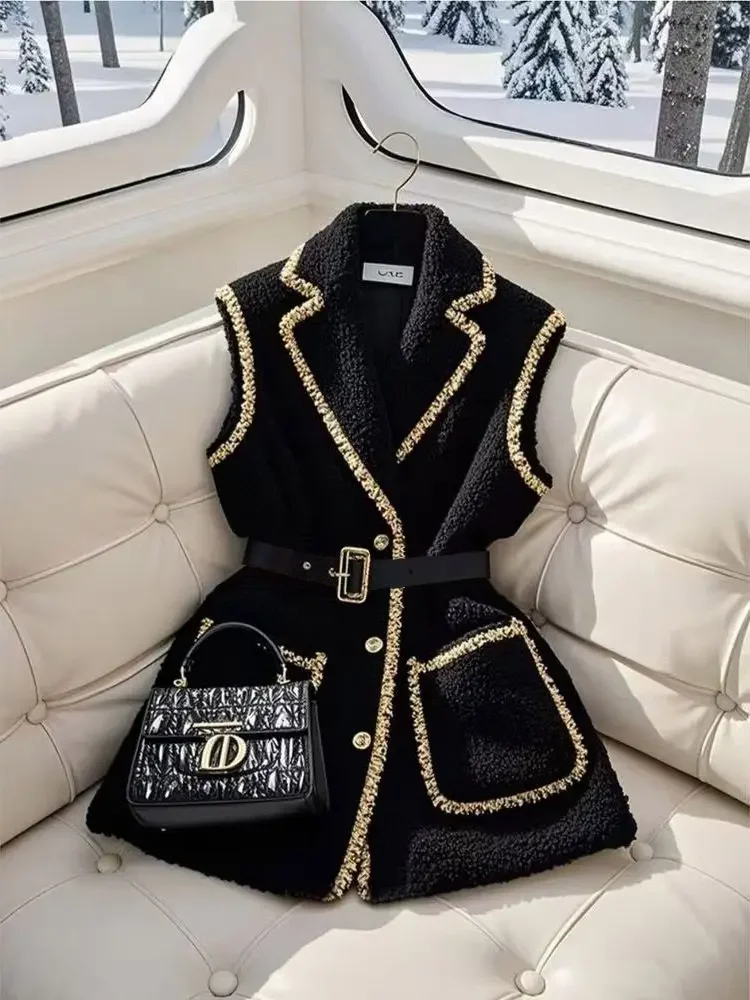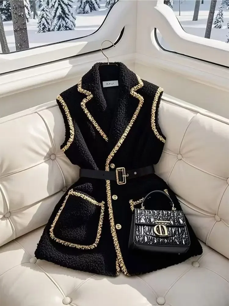 Elegant Women Black Lambhair Vest Coat Luxury Bright Silk Edging with Belt Sleeveless Blazers Vest New Spring Winter Outerwear